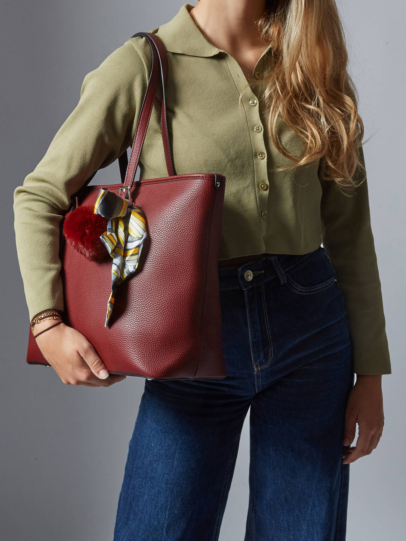 The Grained shoulder bag will accompany you on a day of lessons or at work thanks to its large size. You can easily slip in A4 documents or any other essential accessory for your day. To be carried on the shoulder thanks to its 25 cm handle, this coated canvas bag closes with a zip and has a pocket on the back, a zip pocket inside and 2 single pockets. It is decorated with a small scarf tied on the front for a feminine look.